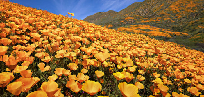 Come suggerisce il suo nome, l’Antelope Valley California Poppy Reserve, è un parco di 7 chilometri quadrati situato nelle remote colline nord-orientali della contea di Los Angeles, che fornisce un “microclima perfetto” per la visualizzazione da satellite dei papaveri della California in fiore, che è il fiore dello stato, ogni primavera. Una superfioritura, d’altra parte, è il risultato di una miscela perfetta di condizioni ambientali che fanno emergere un gran numero di fiori selvatici quasi nello stesso momento.