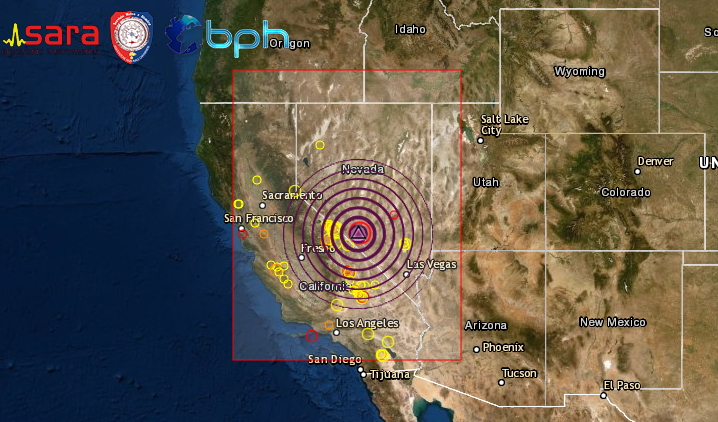 L’epicentro e’ stato localizzato in una zona desertica, 60km a W della località di Tonopah, non dovrebbero esserci danni