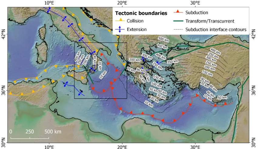 I dati raccolti con la tecnica della tomografia sismica ci permettono di sapere che lo slab raggiunge profondità ancora più elevate all’interno del mantello (oltre 600 km; Piromallo e Morelli, 2003).