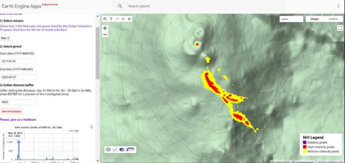 Figura 1 – Screenshot dell’applicativo NHI utilizzato per analizzare la recente attività vulcanica dell’Etna; in alto, mappa di anomalie termiche dal dato Sentinel 2 MSI del 14 aprile 2020; in basso, mappa di anomalie termiche dal dato Landsat 8 OLI del 18 marzo 2017.