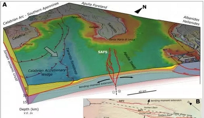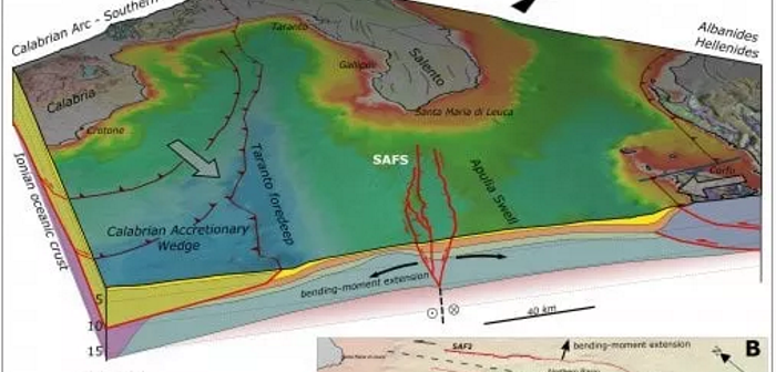 Le aree di avampaese sono tipicamente soggette a terremoti meno frequenti rispetto alle aree lungo i margini di placca e alle aree di catena, tuttavia non sono esenti da eventi di magnitudo anche significativa. In particolare, relativamente all’area studiata è storicamente noto il forte terremoto del 20 febbraio 1743, per il quale i cataloghi storici riportano una magnitudo stimata di 6.7. I cataloghi sismici riportano, inoltre, che questo terremoto causò ingenti danni sia nella regione salentina che nelle isole Ionie (Corfù, Lefkada e Cefalonia), oltre ad un probabile tsunami che interessò il porto di Brindisi. In base alla posizione geografica, alle evidenze di attività recente e all’assenza di altre strutture tettoniche di simile importanza all’interno dell’area di studio, gli esperti INGV e OGS hanno ipotizzato, dunque, che il SAFS possa essere la più probabile sorgente del terremoto del 1743.