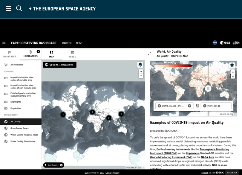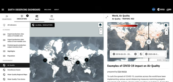Per monitorare la situazione globale e offrire preziose informazioni a istituzioni, enti sanitari e decisori politici, tre agenzie spaziali hanno deciso di unire le proprie forze in una collaborazione senza precedenti, creando un database con i dati raccolti da vari satelliti per offrire una panoramica privilegiata sugli effetti della COVID-19 (l’infezione provocata dal coronavirus SARS-CoV-2) nel mondo intero. Le agenzie coinvolte sono la NASA americana, l’Agenzia Spaziale Europea (ESA) e l’Agenzia Spaziale Giapponese (JAXA), che in seno a una teleconferenza hanno presentato la piattaforma “COVID-19 Earth Observation Dashboard”. Potete consultarla sul sito eodashboard.org.