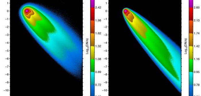 Nuove immagini della cometa C/2020 F3 Neowise realizzate dallo strumento Io Input/Output del Planetary Science Institute. L’immagine è in falsi colori. A sinistra: luce riflessa dalla polvere della cometa; a destra: luce emessa dagli atomi di sodio. Crediti: Jeffrey Morgenthaler e Carl Schmidt