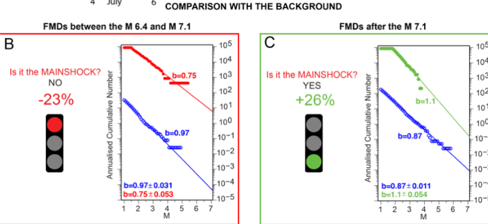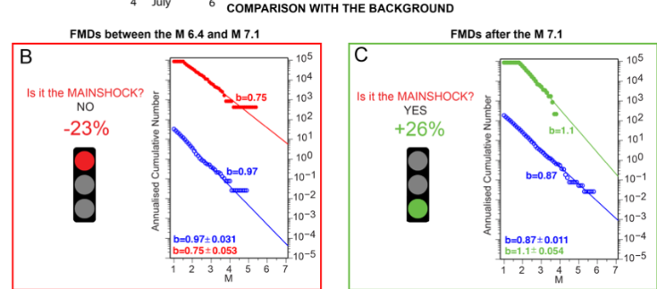 Figura 1 – Risultati del modello di Gulia e Wiemer (Nature, 2019) con i dati preliminari: time series del b-value dell’intera sequenza Sismica (A) calcolato sui piani di faglia degli eventi del 4 (M64) e 6 luglio (M71) con I valori di soglia delle 3 allerte (verde-arandio-rosso). Il valore di riferimento (background) del b-value è indicato con il colore blu. Le linee tratteggiate verticali in colore nero indicano i tempi origine dei due eventi del 4 (M6.4) e 6 luglio (M7.1) mentre l’area in colore grigio indica la deviazione standard di 1 sigma con il metodo di Shi and Bolt, (1982). Il rettangolo nero mostra uno zoom dell’andamento temporale del b-value tra le due scosse. Le immagini B e C indicano la distribuzione della frequenza-magnitudo dei terremoti, nei diversi intervalli temporali, i relativi b-value, le variazioni percentuali rispetto al valore di riferimento e la corrispondente allerta (da Gulia et a., SRL, 2020).