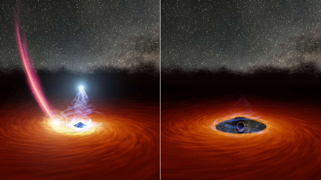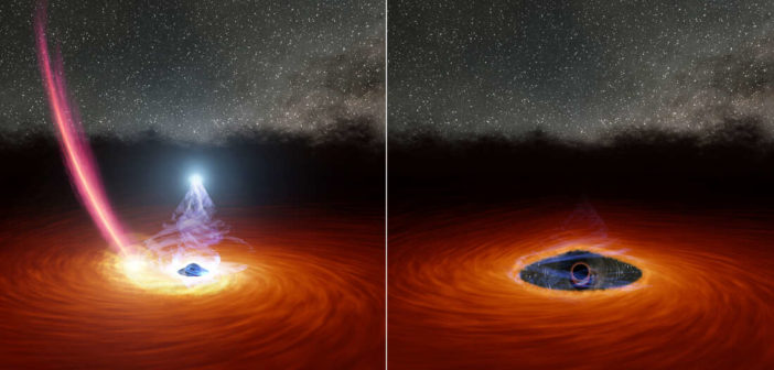 L’illustrazione mostra un buco nero circondato da un disco di gas. Nel pannello di sinistra, una scia di detriti sta cadendo verso il disco. Nel pannello di destra, i detriti hanno disperso parte del gas, facendo scomparire la “corona” (la sfera di luce bianca sopra il buco nero). Crediti: Nasa/Jpl-Caltech