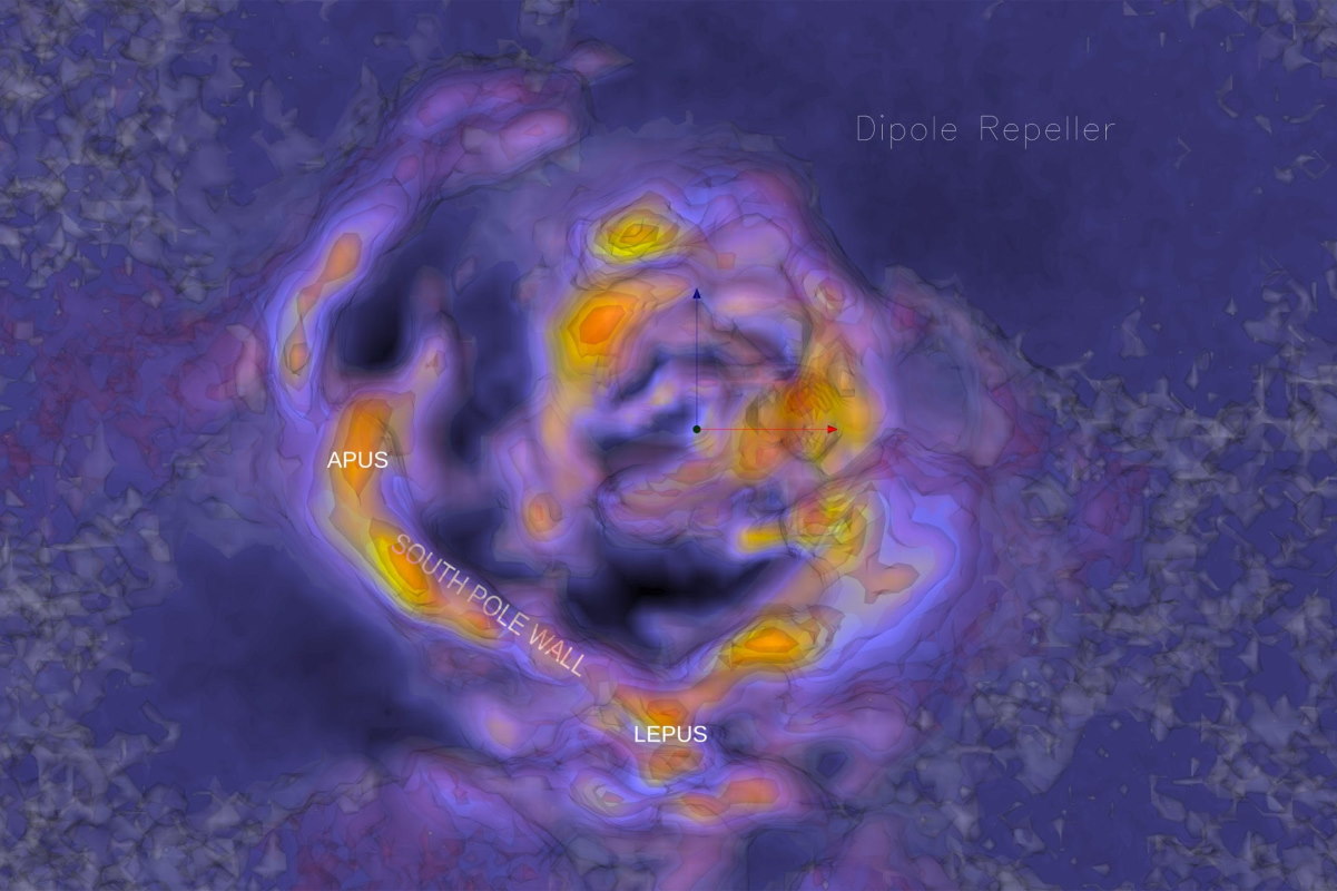 Osservando la mappa hanno visto una strana “bolla” di materia all’incirca nel punto più meridionale del cielo, con un’enorme propaggine che si estendeva verso nord in direzione della costellazione della Balena e nella direzione opposta, verso la costellazione dell’Uccello del Paradiso.