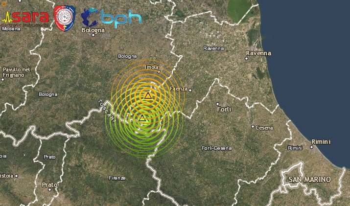 Ipocentro della scossa più forte a circa 9 km di profondità, epicentro nella zona di Borgo Tossignano (BO), eventi avvertiti dalla popolazione in zona epicentrale, Le altre scosse di Ml 2.8, Ml 2.6 e Ml 2.3 con epicentro più a sud, nella zona dell’appennino Ravennate Bolognese