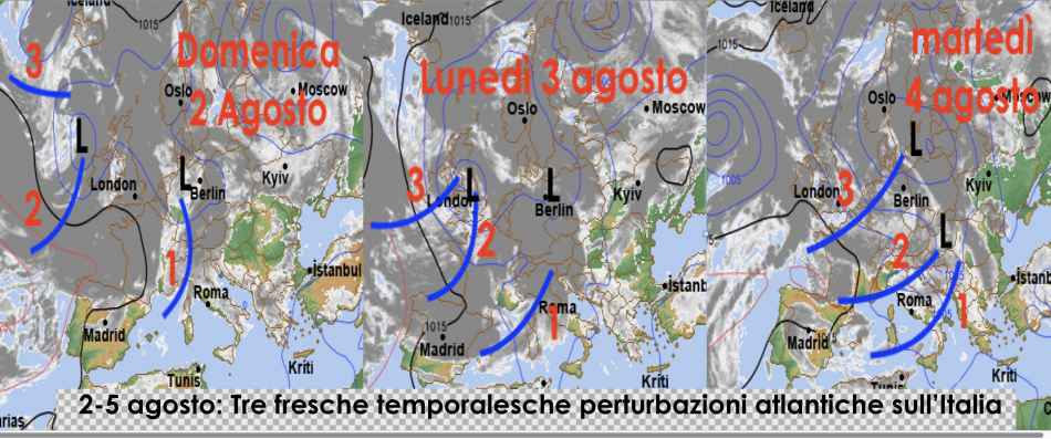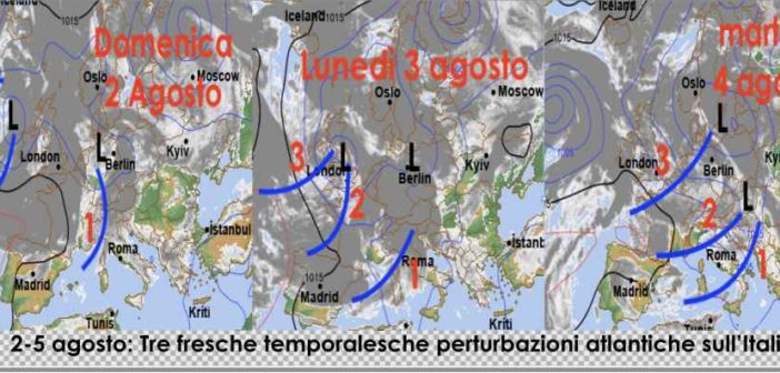 La morte dell’anticiclone africano tra il 3 e il 5 agosto avverrà nella modalità più classica. Infatti all’interno di una profonda ondulazione atlantica – estesa circa 5000 km in verso Ovest-Est –  si inseriranno in rapida sequenza tre perturbazioni atlantiche, ognuna delle quali accompagnata da un nucleo di aria più fresca.