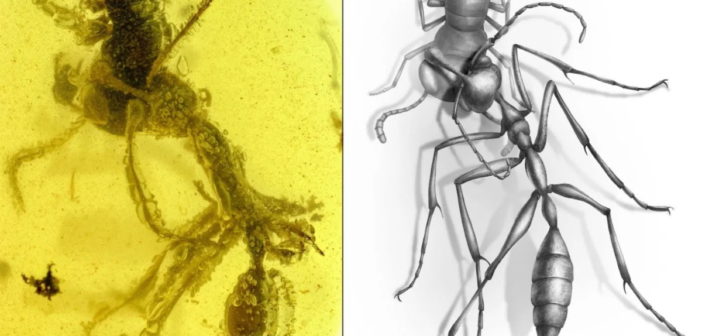 Il tutto però è andato male anche al “carnefice” oltre che alla vittima perché entrambi sono rimasti intrappolati nell’ambra. La scena rimasta immortalata – è proprio il caso di dirlo – offre uno sguardo dettagliato su una specie di formiche preistoriche recentemente identificata (Ceratomyrmex ellenbergeri), e mostra alcune tra le prime prove dirette delle loro caratteristiche assassine, prima tra tutte l’uso delle bizzarre e mortali mandibole simili a falci in un movimento verticale che inchioda la preda.