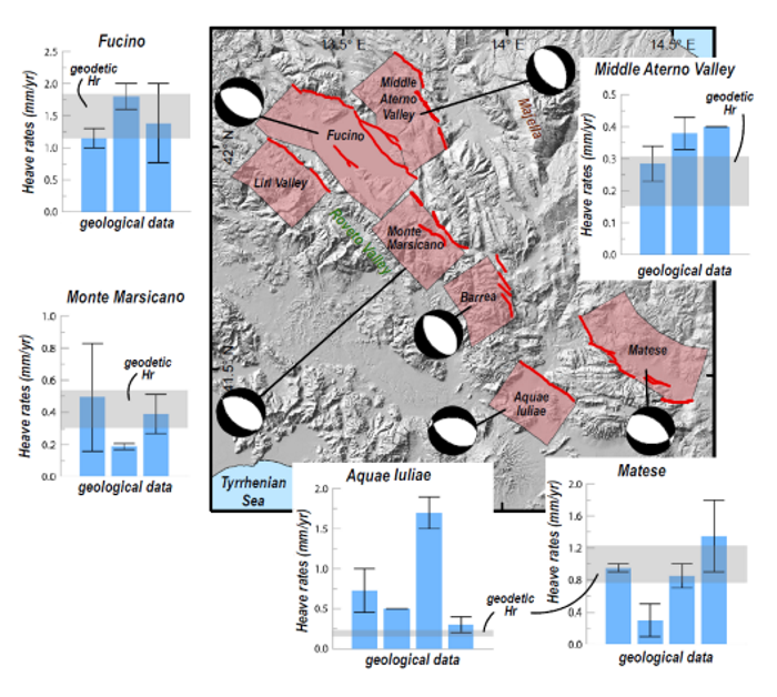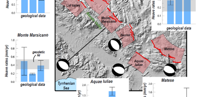 “Questo lavoro”, spiega Michele Carafa, autore della ricerca, “nasce durante la mia permanenza all’UCLA e si è sviluppato nell’ambito del “FIRB Abruzzo”, un importante progetto finanziato dal MIUR tra il 2011 e il 2016 e denominato ‘Indagini ad alta risoluzione per la stima della pericolosità̀ e del rischio sismico nelle aree colpite dal terremoto del 6 aprile 2009’. A mia memoria”, continua Carafa, “questa è la prima ricerca a livello europeo che mira esplicitamente a determinare lo slip rate di tutte le faglie attive presenti in un’importante area sismica, usando congiuntamente informazioni di diversa natura attualmente disponibili nel campo delle geoscienze, come i dati GPS e quelli che descrivono l’orientazione del campo dello sforzo in un materiale viscoelastico, quale è la crosta terreste. Esistono diverse tecniche per determinare lo slip rate di lungo termine: quella più semplice da spiegare si basa sul riconoscimento degli strati di roccia vecchi anche centinaia di migliaia di anni, posti ad altitudini differenti spesso anche centinaia di metri. Secondo una visione geologica classica, questi strati si trovavano inizialmente alla stessa quota, ed è ipotizzabile che l’attuale differenza topografica sia principalmente il risultato dei ripetuti terremoti avvenuti in tempi successivi lungo la faglia in esame, spesso determinabili con tecniche più o meno complesse. Ed è stato esattamente questo l’obiettivo del nostro gruppo di ricerca” prosegue Carafa, “avere dei primi dati per capire se, nell’arco degli ultimi 15-20 anni per i quali esistono misure geodetiche accurate, il comportamento del volume di roccia adiacente alla faglia sia compatibile con le stime disponibili di slip rate di lungo termine, ovvero quelle basate su metodi geologici. La risposta è stata sostanzialmente positiva: le stime di breve e lungo termine sono risultate congruenti fra loro. Questo risultato ci permetterà di capire e stimare meglio le forze responsabili dell’evoluzione tettonica degli Appennini e, quindi, in prospettiva di valutare con maggior accuratezza la pericolosità sismica della regione. Guardando indietro, posso dire che questa è stata veramente una bella sfida scientifica. Da un lato, i ricercatori esperti in geodesia del nostro team hanno raccolto tutte le informazioni necessarie per definire lo spostamento medio annuo di ciascuna delle stazioni GNSS distribuite nell’area di studio tra i vari accadimenti sismici, dall’altro, i ricercatori esperti in tettonica attiva hanno esaminato nel dettaglio la letteratura scientifica al fine di identificare le faglie comunemente accettate come attive. Infine, i modellisti hanno sintetizzato le informazioni ottenute dai due gruppi per giungere, utilizzando un metodo decisamente sofisticato, a calcolare lo slip rate medio di ciascuna faglia”.