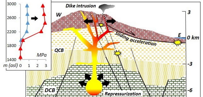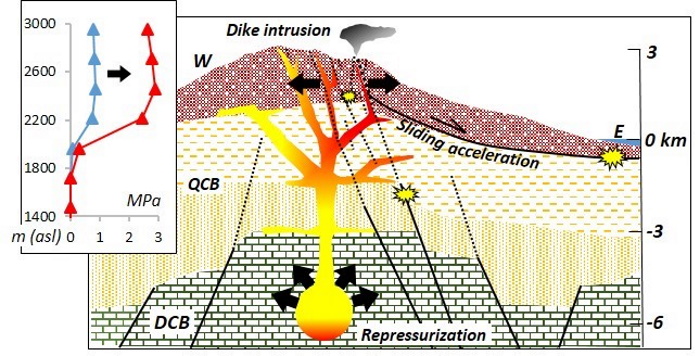 Figure 3 – Schematic representation of the processes in progress. Inset represents depressurization vertical profiles due to flank collapse, back to sliding plane.