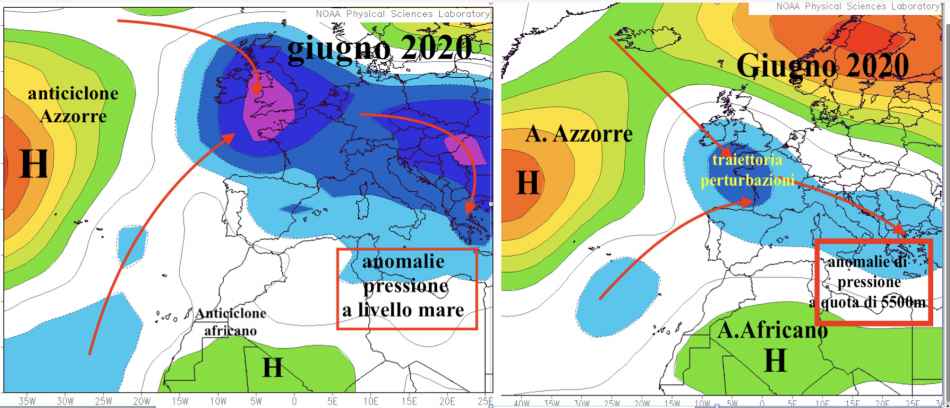 La presenza dell’anticiclone Nord africano nell’agosto 2020 è testimoniato dalle anomalie positive si pressione alla quota di 5500 rispetto al periodo 1981-2010. Anche l’anomalia di pressione al livello del mare (bassa pressione termica da Marocco fino Spagna,Sud della Francia) indica la presenza dell’Anticiclone Africano.