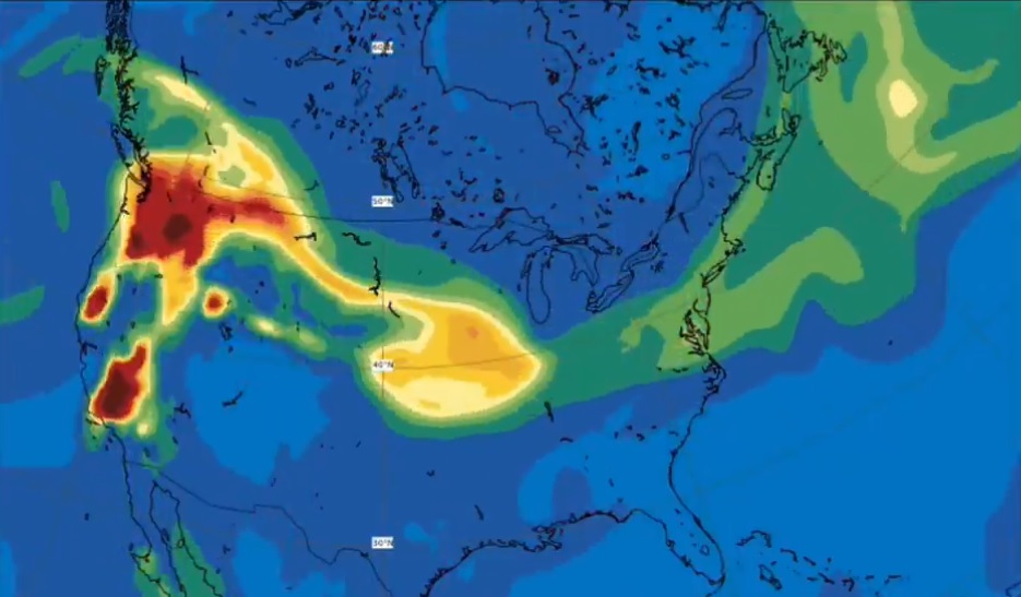 Il fumo degli incendi in California, Oregon e Stato di Washington che viaggia verso ovest / ESA
