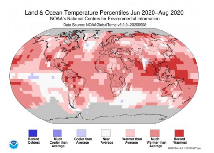 Secondo la National Oceanic and Atmospheric Administration Usa, l’emisfero settentrionale ha appena vissuto la sua estate più calda e il più caldo agosto mai registrati e, a livello globale, è stato il secondo agosto più caldo mai registrato con 0,94°C  sopra la media del XX  secolo di 15,6°C.