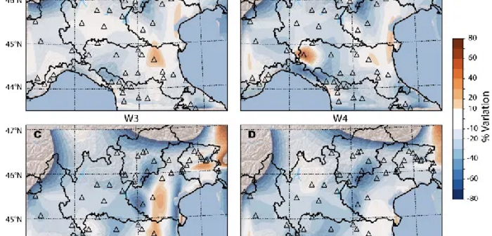 Un comportamento molto diverso si osserva invece in alcuni siti ubicati principalmente in Pianura Padana, circondati da poli industriali produttivi, dove il rumore sismico si riduce in modo molto lieve, o in qualche caso non si riduce affatto durante le 4 settimane successive all’introduzione delle misure di lockdown.
