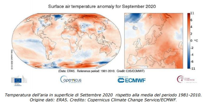 Erano bastate poche giornate di maltempo per far sentenziare a molti che il riscaldamento globale non esiste e che a settembre non era mai stato così freddo. Teorie di chi continua a scambiare il meteo locale per il clima globale e subito smentite da Copernicus Climate Change Service (C3S) che ha annunciato che «Le temperature globali di settembre 2020 sono state le più alte rispetto a qualsiasi settembre precedentemente registrato».