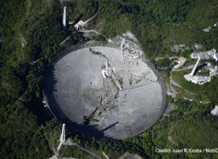 nel ultime ore tuttavia la struttura sospesa sopra il riflettore parabolico è collassata al suolo distruggendo e distruggendo anche parte del disco sottostante (già interessato da precedenti danni). Questo ha sicuramente messo fuori la parola “bene” anche sulla possibilità di una futura ripresa. Tenuto conto dei danni precedenti, ai quali si aggiungono quelli di queste ore, si tratterebbe di fare un radiotelescopio completamente nuovo.