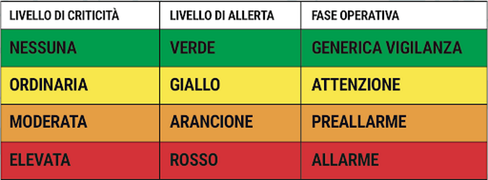 Allerta rossa, arancione e gialla, sono queste le colorazioni che vengono usate dalla Protezione civile Italiana, per contraddistinguere i vari livelli d’allerta, che poi portano all’attivazione dei protocolli necessari a mitigare il rischio corrispettivo, al fine di prevenire eventuali situazioni di potenziale criticità-