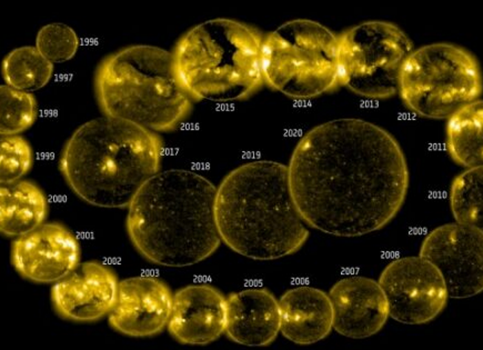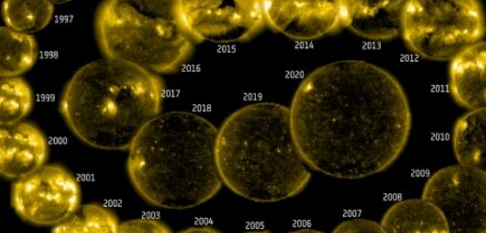 L’Osservatorio solare ed eliosferico Soho dell’Esa/Nasa ha osservato il Sole per 25 anni, registrando due cicli solari di 11 anni del Sole. Questa sequenza di 25 immagini catturate dal telescopio alle frequenze dell’estremo Uv mostra il volto mutevole del nostro Sole nei diversi anni. Le immagini più luminose corrispondono ai periodi di massimo solare, quando il campo magnetico del Sole è altamente dinamico. Crediti: Soho (Esa/Nasa)