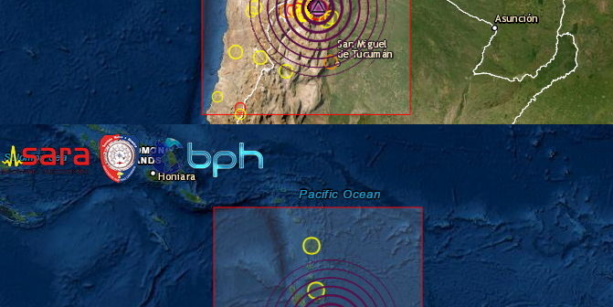 Per quanto riguarda il sisma Argentino, l’epicentro è stato localizzato 37 km a WNW della località di San Antonio de los Cobres, mentre per l’evento nel Pacifico, 47 km a E di Lakatoro. Gli eventi sono stati entrambi avvertiti in maniera anche a grande distanza, vista la profondità ipocentrale, ma non si registrano, per fortuna, danni a cose e persone