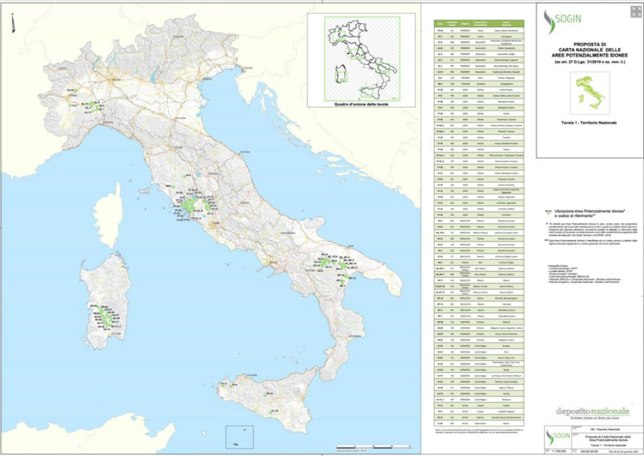 La Carta nazionale delle aree potenzialmente idonee (Cnapi) a ospitare il Deposito nazionale dei rifiuti radioattivi che si stima costerà 1,5 miliardi di euro è stata pubblicata dalla Sogin, grazie al nulla osta arrivato dal Mise e dal Mattm dopo sei anni di silenzio: la Cnapi è pronta infatti dal 2015, ma fino ad oggi il documento non è mai stato divulgato, probabilmente per non urtare le varie “sensibilità” Nimby e Nimto che affollano lo Stivale.