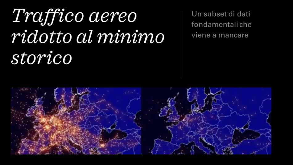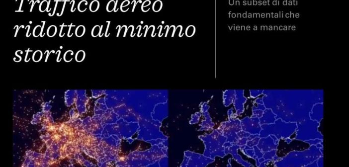 Nell’immagine di copertina è evidente come il lockdown imposto a livello Europeo e Mondiale dal Covid-19 impatti in modo devastante sul numero di aerei in transito sui cieli di tutto il mondo. Il confronto tra il prima pandemia e l’inizio del lockdown mondiale per il traffico aereo è tutto riassunto nel frame.