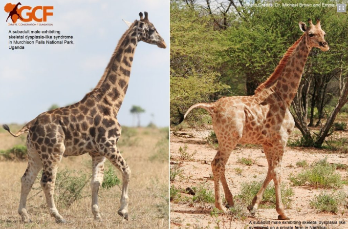 La prima delle due giraffe che soffrono di un tipo di displasia scheletrica è stata avvistata e misurata nel Murchison Falls National Park in Uganda durante un censimento fotografico e si è subito capito che aveva delle gambe visibilmente più corte delle altre giraffe. Poi, durante una ricerca simile svolta in Namibia è stata trovata un’altra giraffa con anomalie morfologiche simili.