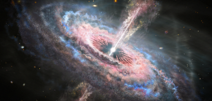 Non sono finite qui, le sorprese di J0313-1806. Le osservazioni di Alma hanno infatti fornito dettagli anche riguardo la galassia ospite – proprio quella “oscurata” dalla prorompente attività in corso nel suo centro – mostrando che essa sta formando nuove stelle a un ritmo 200 volte superiore a quello della Via Lattea, un tasso piuttosto alto in galassie di età simile, che indica che la galassia sta crescendo molto velocemente. Parallelamente, gli scienziati hanno calcolato dalla luminosità del quasar che il buco nero sta inghiottendo l’equivalente di 25 Soli ogni anno. L’energia rilasciata da questa incessante abbuffata, dicono gli esperti, sta probabilmente alimentando un potente flusso di gas ionizzato che si muove a circa il 20 per cento della velocità della luce. Sono proprio flussi in uscita come questo che privano poco a poco la galassia del combustibile necessario alla formazione di nuove stelle, finendo per arrestarla.