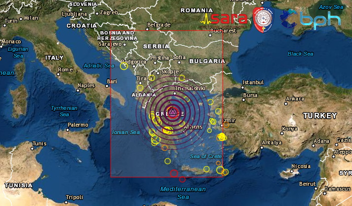 Epicentro sulla terraferma, nella zona di Larissa, ipocentro a 20 km di profondità, potrebbero esserci danni. Evento avvertito anche in Puglia e Calabria