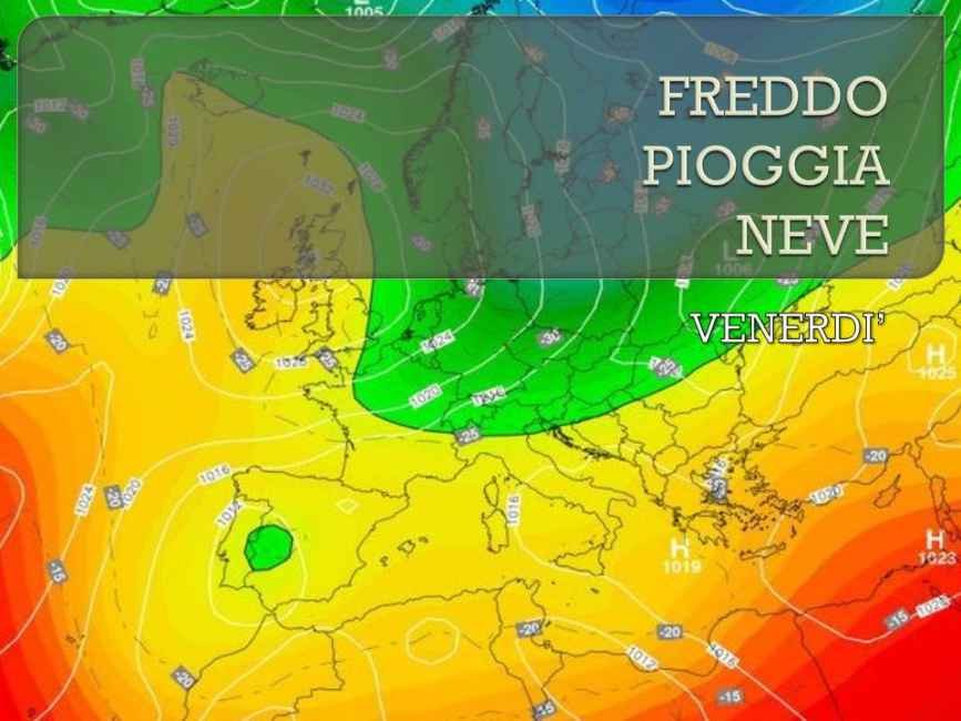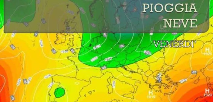 Tra la fine di giovedì e la giornata di venerdì infatti irromperanno sull’Italia delle correnti di origine polare provenienti da nord, con conseguente diffuso peggioramento del tempo. Venerdì in particolare ci sarà un primo diffuso calo delle temperature, sebbene non intenso: in generale un paio di gradi in meno rispetto alla giornata precedente. Rispetto ai giorni precedenti ci saranno anche più nuvole, e il cielo si presenterà nuvoloso in gran parte d’Italia. Ma il vero cambiamento riguarderà la pioggia, che tornerà a bagnare quasi tutte le regioni del Nord, a eccezione di Emilia e Romagna, e più giù qualche pioggia è attesa anche su Toscana, Lazio, Campania, Calabria, Sicilia e Sardegna. A completare il quadro del peggioramento ci sarà anche la neve, che tornerà a imbiancare le zone alpine al di sopra di 1200-1400 metri.