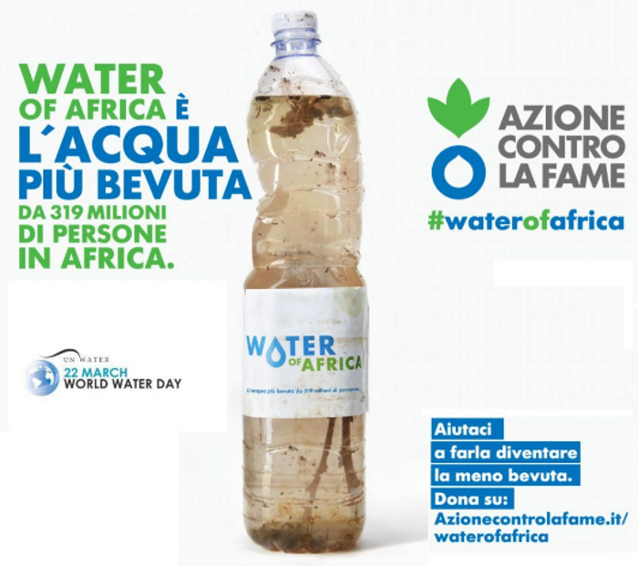 In occasione del World Water Day , la Giornata mondiale dell’acqua, Azione contro la Fame, l’ONG umanitaria internazionale specializzata nella lotta contro le cause e gli effetti della fame e della malnutrizione infantile, riaccende i riflettori sulla carenza di acqua potabile e lo fa a partire da oggi “vendendo” acqua con il marchio “Water of Africa”: «E’ contaminata: può contenere batteri, parassiti e virus. E’ l’acqua che mai nessuno si azzarderebbe neanche a sorseggiare. Eppure, nell’Africa Subsahariana319milioni di persone, ogni giorno, non hanno un’alternativa».
