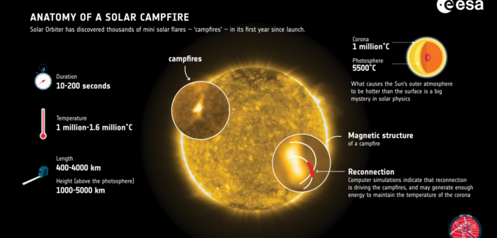 Comprendere il riscaldamento della corona è uno degli obiettivi scientifici di Solar Orbiter, la sonda dell’Agenzia spaziale europea (Esa) in collaborazione con la Nasa lanciata nel febbraio 2020 per osservare il Sole con un dettaglio senza precedenti. La missione scientifica vera e propria di Solar Orbiter inizierà solo a novembre, ma le prime immagini, raccolte a pochi mesi dal lancio e pubblicate lo scorso luglio, hanno iniziato a mostrare aspetti inediti, primi fra tutti dei misteriosi e ubiqui brillamenti in miniatura soprannominati “falò”.