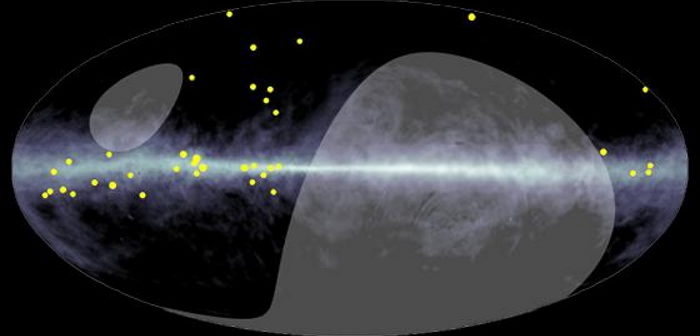 I raggi gamma diffusi ad altissima energia (punti gialli) sono distribuiti lungo la Via Lattea. Il contorno del colore di sfondo mostra la distribuzione dell’idrogeno atomico in coordinate galattiche. L’area grigia ombreggiata indica ciò che si trova al di fuori del campo visivo. Crediti: Heasarc / Lambda / Nasa / Gfsc