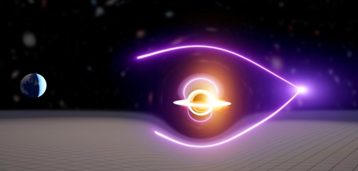 In questa rappresentazione artistica, a metà strada fra noi osservatori (a sx) e la sorgente del lampo di raggi gamma (a dx), un buco nero di massa intermedia che, curvando lo spaziotempo, agisce da lente gravitazionale. Crediti: Carl Knox, OzGrav
