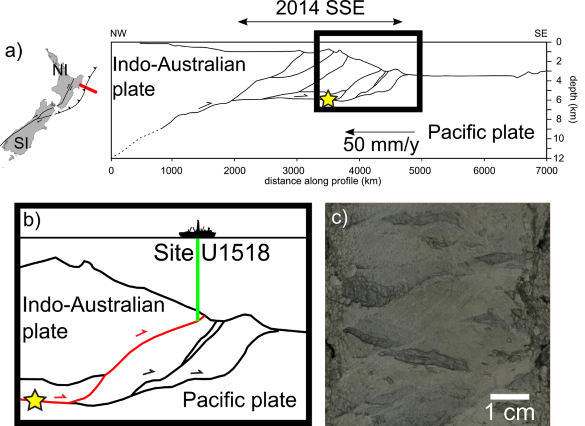 Fig. b) Posizione della perforazione oceanica IODP (linea verde) e della faglia di subduzione (linea rossa)