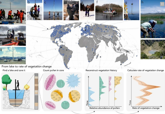Tuttavia, ogni carota di sedimenti fornisce informazioni solo su un luogo sulla Terra, quindi vere analisi su scala globale del cambiamento della vegetazione passato richiedono l’accumulo e la cura di molti di questi dati. I risultati del nuovo studio si basano sui dati 1,181 campioni di pollini fossili provenienti dal Neotoma Paleoecology Database che archivia diversi tipi di dati fossili, paleoecologici e paleoambientali.