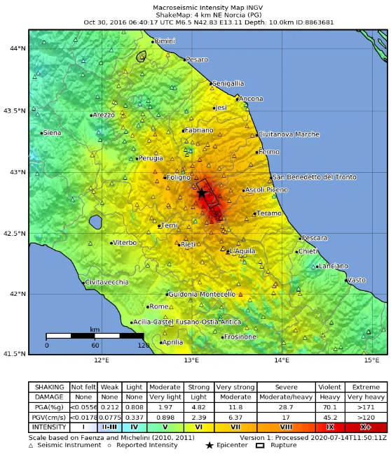 Le ShakeMaps che vengono generate in termini di intensità macrosismica evidenziano il livello di scuotimento osservato utilizzando colori più caldi (dall’azzurro al rosso intenso) man mano che lo scuotimento aumenta: i toni caldi, dal giallo scuro al rosso indicano il territorio che ha fortemente risentito il terremoto, sia come percezione da parte della popolazione, sia come eventuali danni sull’edificato; i toni freddi della mappa (verde, azzurro) indicano, invece, le aree in cui lo scuotimento è stato tale da non poter aver provocato danni, anche se la popolazione potrebbe aver percepito lo scuotimento stesso. A titolo di esempio, è mostrata in Figura 1 la mappa in intensità macrosismica relativa al terremoto del 30 ottobre 2016 Mw 6.5 avvenuto vicino a Norcia. Come si può osservare dalla mappa e dalla legenda associata, oltre alle informazioni relative al terremoto (località, coordinate epicentrali, profondità, tempo origine e magnitudo) ricavate dall’attività della Sala di Sorveglianza Sismica dell’INGV, sono riportate anche le posizioni delle stazioni sismiche (i triangoli) i cui dati sono stati usati nell’analisi.