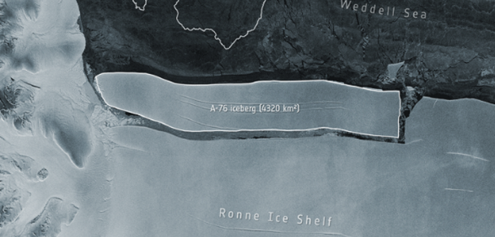 Un enorme iceberg si è staccato dal lato occidentale della piattaforma di ghiaccio Ronne, che si trova nel mare di Weddell, in Antartide. L’iceberg, soprannominato A-76, misura circa 4320 kmq, rendendolo attualmente il più grande berg del mondo.