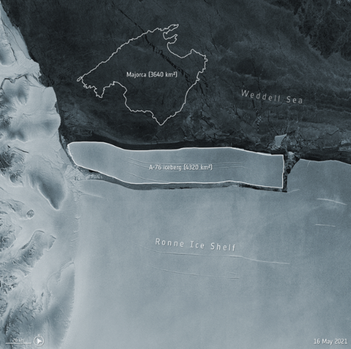 Avvistato in immagini recenti catturate dalla missione Sentinel-1 di Copernicus , l’iceberg è lungo circa 170 km e largo 25 km, ed è leggermente più grande dell’isola spagnola di Maiorca.