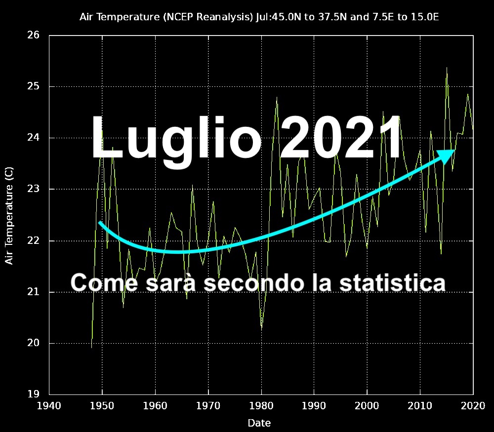 Volendo essere più espliciti, nel luglio-2019 la temperatura massima di 34 gradi fu superata in media 15 giorni su 31 su tutte le località tranne quelle costiere e montane. Come dire che anche nel 2021 dovremo mettere in conto almeno 10-15 giornate roventi.