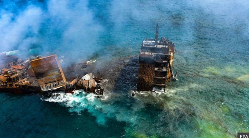 Negli ultimi giorni erano intervenute le marine dell’India e dello Sri Lanka riuscendo a spegnere l’incendio a bordo e cercando di evitare che la nave si spezzasse in due e affondasse, ma il mare mosso e i monsoni hanno ostacolato l’operazione.
