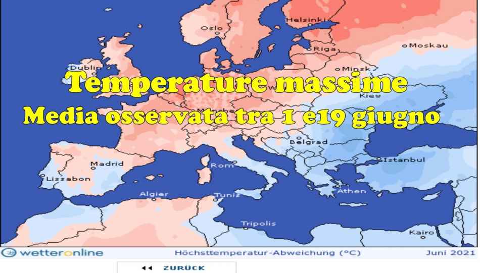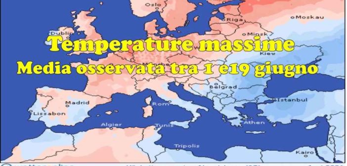 Anche se la terza decade dovesse risultare molto calda al C/Sud, alla fine la media termica del mese risulterà quasi nella norma o appena al di sopra della norma. Infatti, come mostra l’immagine di copertina, il mese alla data del 19 giugno risulta al Centrosud con una media climatica inferiore a quella prevista per i primi 20 giorni di giugno.