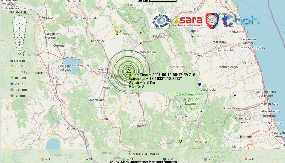 Una scossa di terremoto di magnitudo 2.9 è avvenuta alle ore 07:17:59 italiane nella zona di Assisi (PG)  in Umbria con ipocentro alla profondità di 8,3 km.