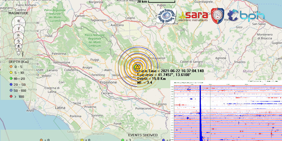 Un terremoto di magnitudo (Ml) 3.4 è avvenuto alle ore 18:37:04 ed è stato localizzato nella zona di Sora, in provincia di Frosinone nel Lazio, con ipocentro alla profondità di 15,8 km. Scossa seguita da una replica di Ml 2.4 con medesimo epicentro alle ore 18:51:40 con ipocentro alla profondità di 16 km