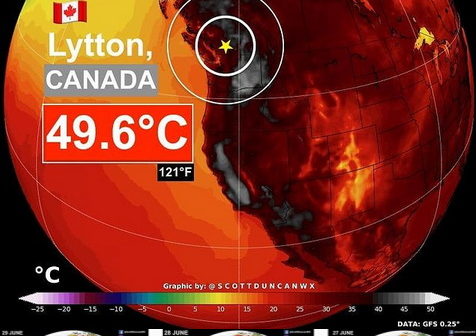 Il Canada ha stabilito martedì 29 giugno un nuovorecord di caldo estremo, l’ennesimo per il terzo giorno consecutivo: infatti sono stati registrati 49,5°C a Lytton, un villaggio a nordest di Vancouver, nel bel mezzo di un’ondata di calore che sarebbe all’origine di decine di morti improvvise segnalate negli ultimi giorni nella regione.