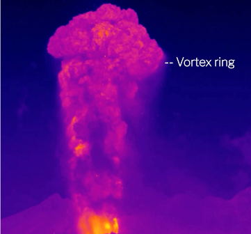 I vortex rings vulcanici sono vortici ad anello che si formano intorno alla cima di una nube eruttiva durante i primi secondi dell’evento, come i mulinelli che si formano dietro un remo spinto nell’acqua. La dimensione, la velocità e le caratteristiche di questi vortici riflettono fattori utili per valutare quanto sia pericolosa l’eruzione, come la sua intensità o la profondità della bocca eruttiva da cui ha avuto inizio.