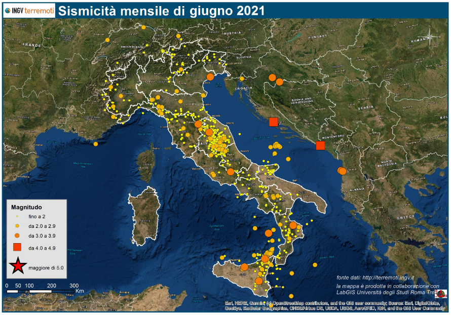 Mappa dei terremoti avvenuti in Italia e nelle aree limitrofe dal 1 al 30 giugno del 2021.