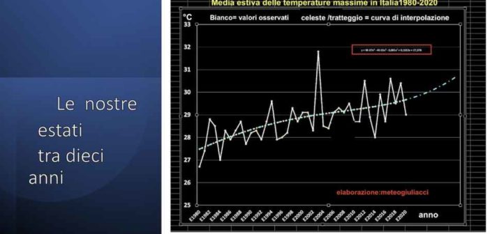 Per poter conoscere la tendenza climatico estivo sulll’Italia, ovviamente è indispensabile esaminare la tendenza termico osservata nei recenti decenni. Nella figura di copertina è mostrata la temperatura media estiva negli ultimi 40 anni.