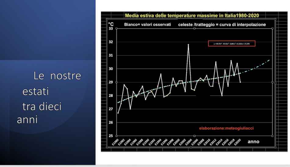 Il grafico di copertina mostra l’andamento, anno per anno, della media estiva delle temperature massime in Italia.