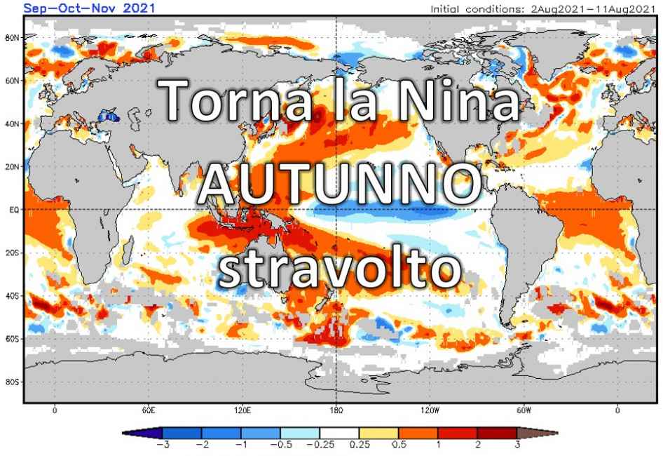 Il più recente rilevamento delle temperature superficiali delle acque del Pacifico (giugno 2021) aveva comunque evidenziato lievi anomalie negative che si aggiravano mediamente nell’ordine dei – 0,5°C, ma ora sembra esserci un cambio di scenario ben più radicale tant’è che lo scarto dalle medie si è portato a – 1°C, il doppio da inizio estate; una situazione oltretutto che verrà confermata con alte probabilità anche nei prossimi mesi e, se questo venisse convalidato, la tendenza autunnale potrebbe essere stravolta.